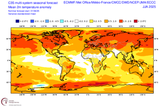 The ensemble mean of several long range models favours warmer than normal conditions across much of Canada and the United States this summer. Credit: Copernicus Climate Change Service.