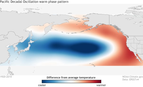 The warm (positive) phase of the PDO. Credit: NOAA.
