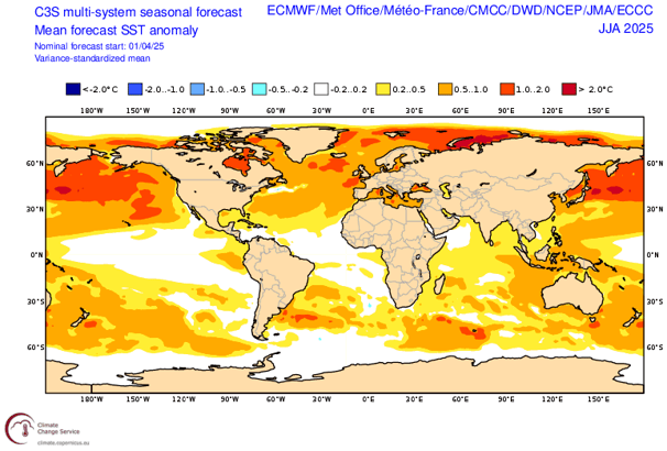 Now that we have gotten all of that out of the way, we can look ahead to what may be in store. It should come as no surprise that the climate system is complex, making it hard to predict the future several months down the road. Moreover, climate drivers like ENSO tend to have their strongest influence on the atmosphere during the Northern Hemisphere winter, making summer a bit of a wild card – but that’s not going to stop me from taking a crack at it!