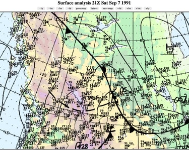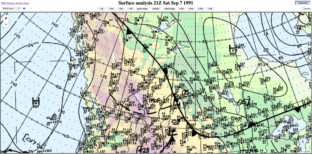 Figure 14: Surface analysis at 6PM MDT, 7 September 1991. Credit: NOAA.