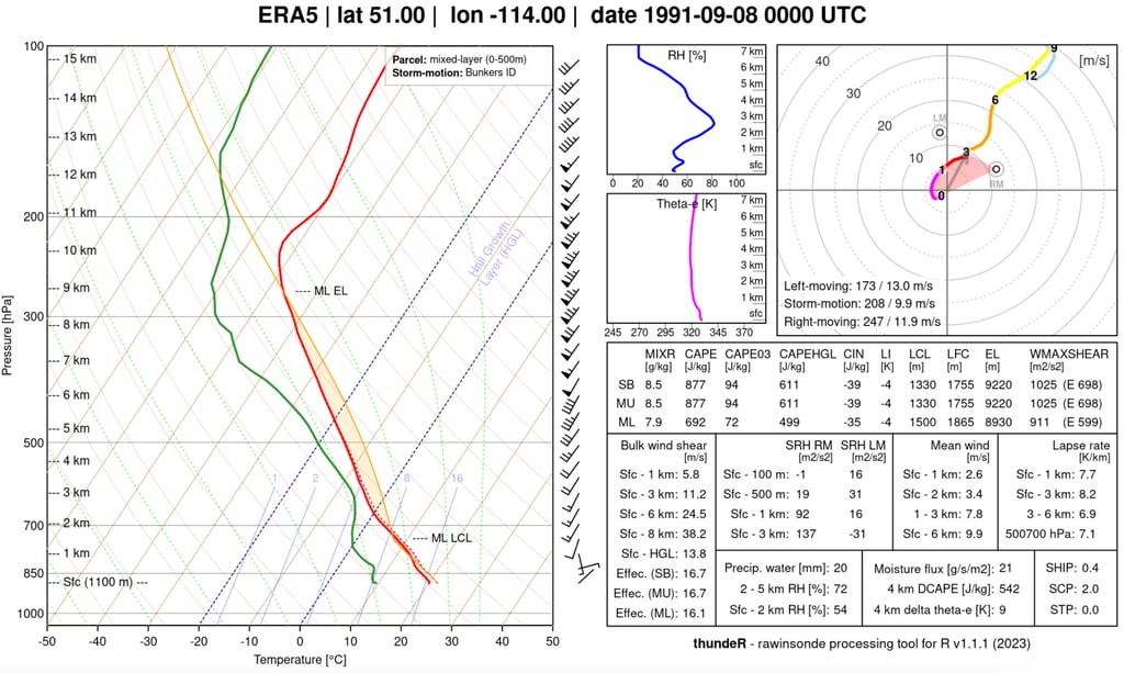 Figure 15: ERA5 reanalysis sounding and hodograph for 6PM MDT, 7 September 1991 in Calgary. Credit: rawinsonde.com