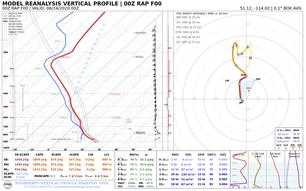 Figure 27: RAP reanalysis sounding and hodograph at 6PM ,13 June 2020 in Calgary. Credit: rawinsonde.com