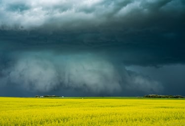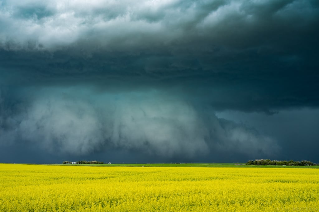 Figure 6: Ominous storm clouds serve as a striking backdrop to flowering canola fields over southern Alberta. Maturing wheat, barley, and canola are known to give off lots of moisture to the lower atmosphere through evapotranspiration when crops aren't water stressed. This period of crop maturation, usually through the month of July, often correlates with the peak of Alberta's severe weather season.