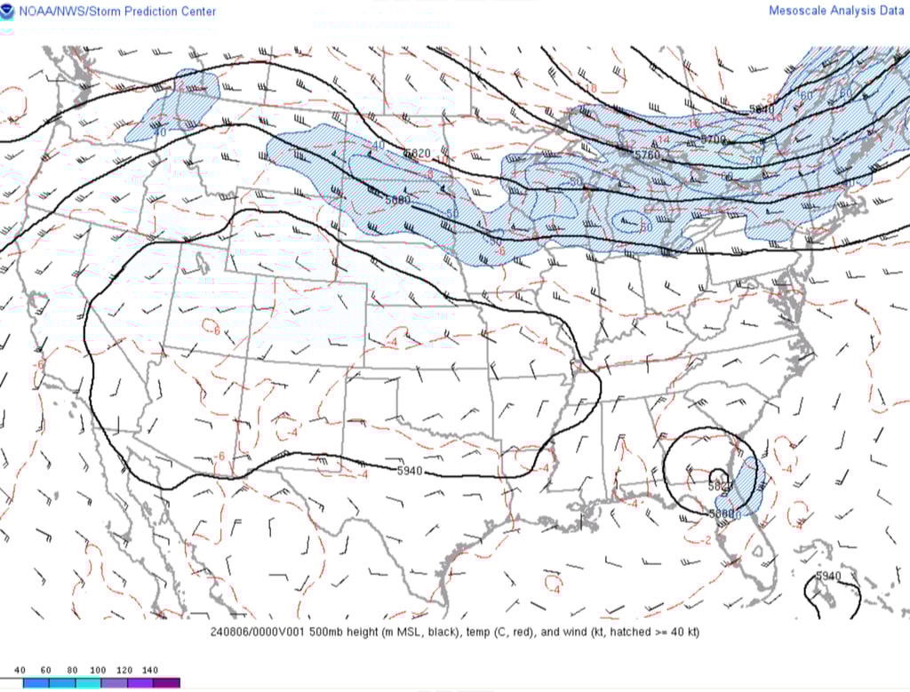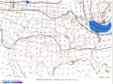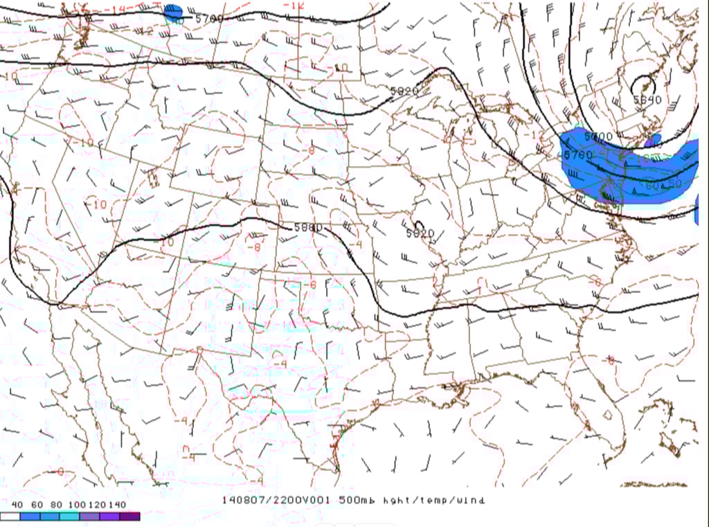 Figure 22: RAP 500mb height and wind analysis at 4PM MDT, 7 August 2014. Credit: NOAA/SPC.