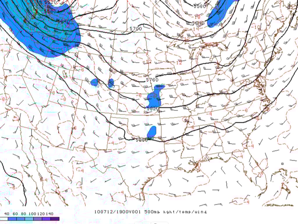 Figure 16: RUC 500mb height and wind analysis at 1PM MDT, 12 July 2010. Credit: NOAA/SPC.