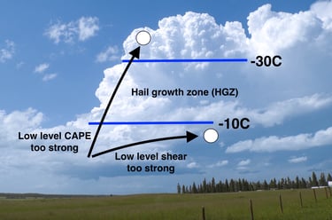 While these factors are ideal for tornadoes, too much buoyancy or wind shear below the hail growth zone can disrupt hail formation. In these situations, hail embryos may be launched out of the updraft too quickly or carried out of the storm before they can grow efficiently.