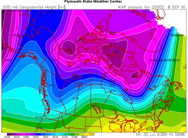 Figure 13: 500mb height analysis at 6PM MDT, 7 September 1991. Credit: Plymouth State Weather Center.