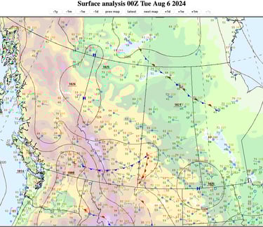 Aloft, the upper ridge associated with the infamous 2021 Heat Dome moves east into the eastern Prairies as it continues to break down, bringing modest southwesterly flow aloft into Alberta (Figure 28). An upper disturbance is moving through far northeastern Alberta, with another one approaching southern Alberta from the west.